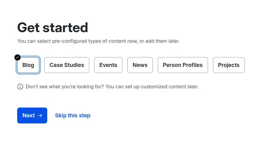 Pirmajā solī varat izvēlēties satura tipus, kurus izmantosiet savā vietnē. Atkarībā no izvēles Drupal noteiks, kurus moduļus aktivizēt pārvaldības saskarnē.