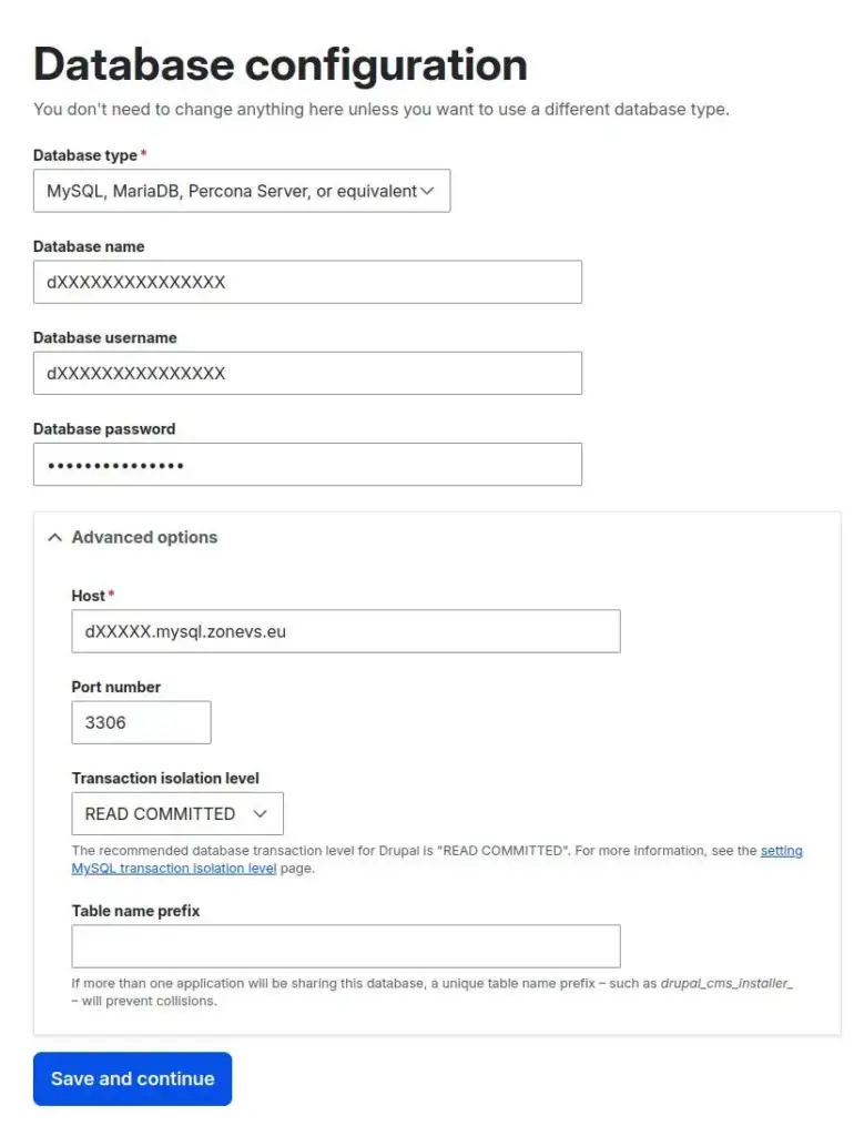 Ievadiet iepriekš izveidotās datubāzes nosaukumu un lietotāja datus. Papildu opcijās jānorāda arī Host, ko atradīsiet virtuālā servera pārvaldības panelī sadaļā Sistēmas informācija. Izmantojiet tur norādīto MySQL/MariaDB servera adresi.