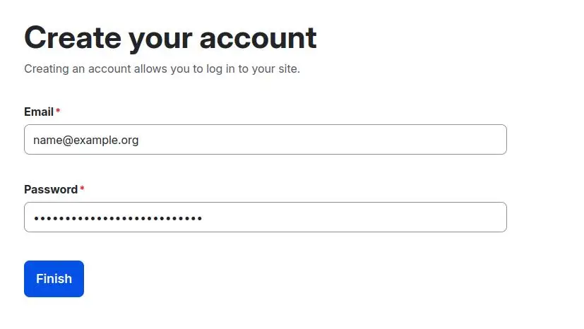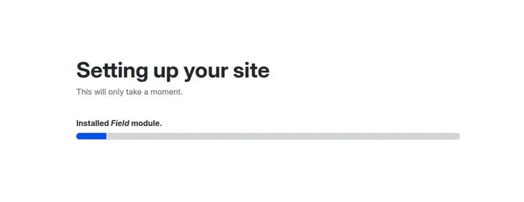 Nospiediet “Pabeigt”, un Drupal sāks vietnes instalēšanu un konfigurēšanu. Šis process var aizņemt dažas minūtes, un progresa josla būs redzama ekrānā.