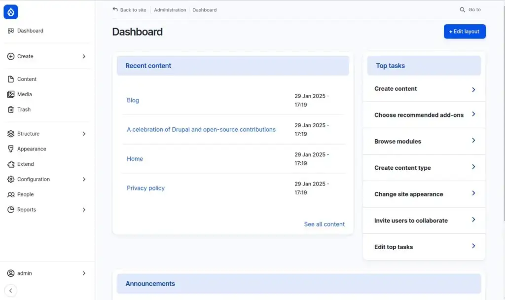 Pēc instalācijas pabeigšanas jūs tiksiet novirzīts uz Drupal CMS administrācijas paneli, kur varēsiet pārvaldīt savas vietnes saturu.