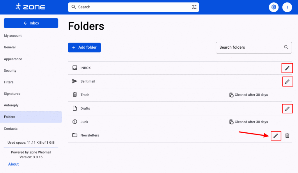 Folders settings can be changed by clicking on the gear on the main webmail page: