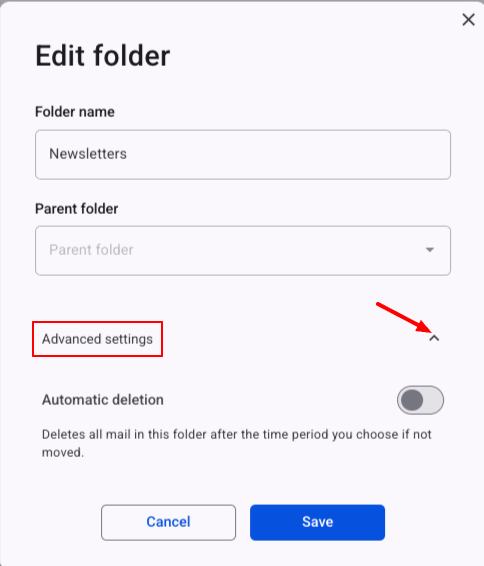 In a new window, the folder settings will open, and if you click the arrow next to Advanced settings, you will be given the option to configure automatic deletion.