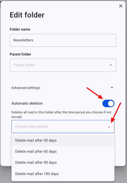 To activate automatic deletion, you need to activate the corresponding option and then select the period. The deletion periods can be selected from 30, 60, 90 and 180 days, after which emails in the folder will be deleted.
