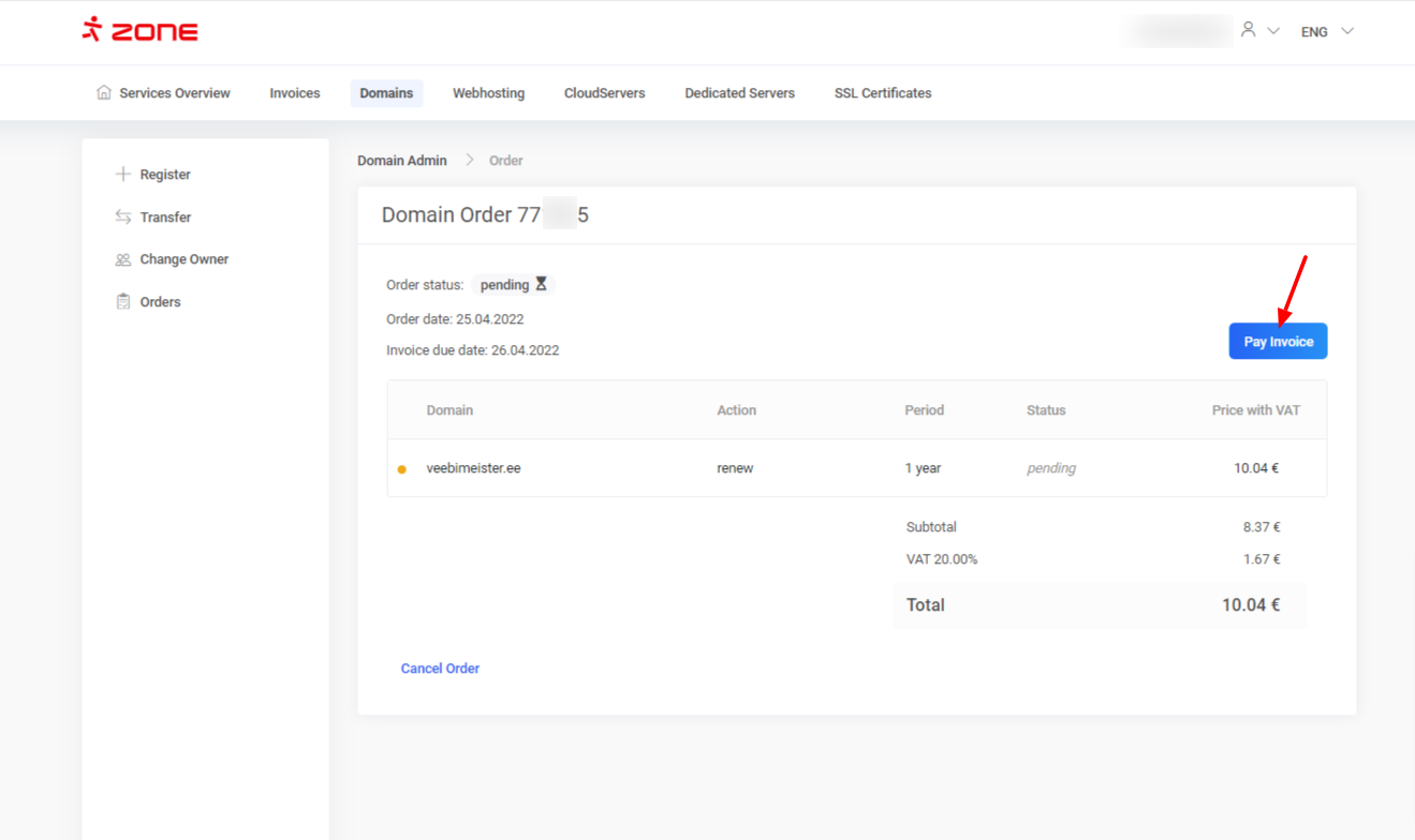 To cancel domain’s renewal order simply click on the “View order” button from “Overview” window