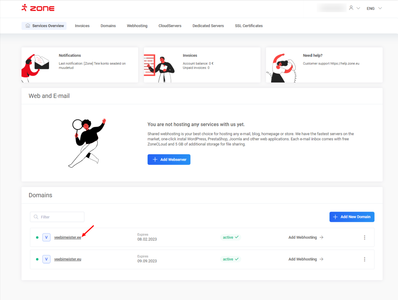 In “My Zone” control panel click on your domain name from “Services Overview” window.