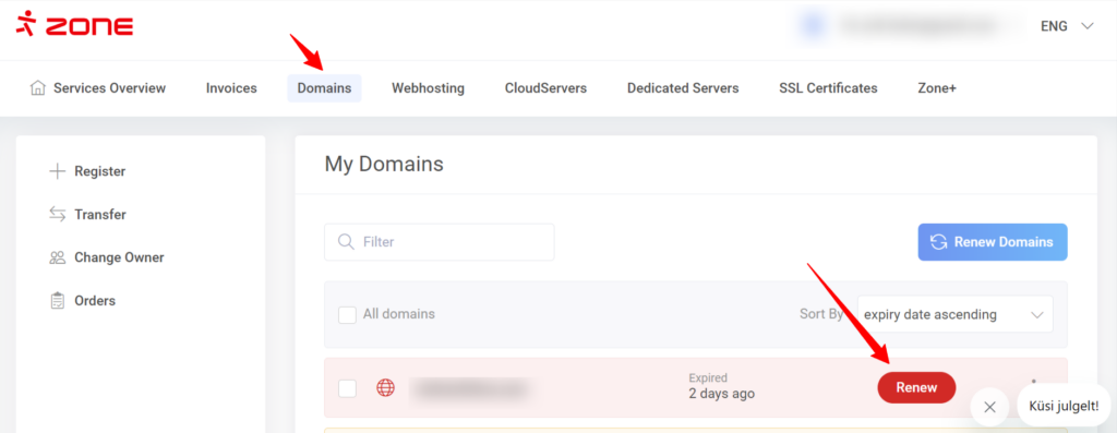 In order to reactivate an expired domain go to Zone website click on My Zone button and log in with your ZoneID user credentials. Click on the Domains section on the services overview page. In the My Domains section, you can see the domains associated with this account. To reactivate an expired domain, click Renew next to the domain name. The next step is to choose the number of years you want to renew the domain for and confirm the order. It will be processed once the invoice is paid and payment has been received in the Zone system. Any already submitted orders and generated invoices will be displayed in the Orders section.