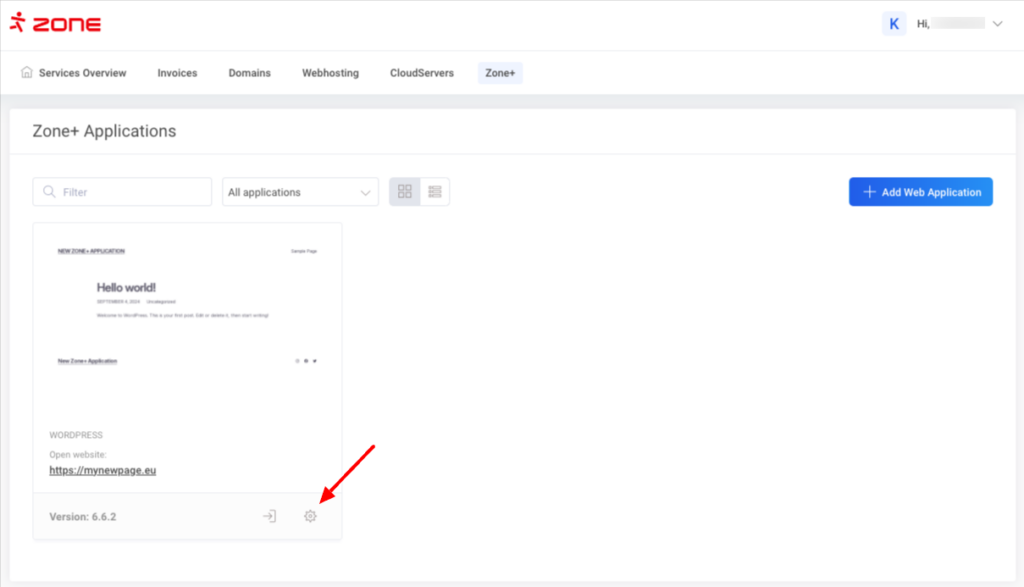 First, open the Zone+ menu at the top and navigate to the applications section. Look for the appropriate WordPress application to create a testing environment for. In the application view, click on the Settings button.