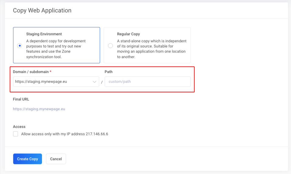 On the page that opens for application copying, Staging Environment should be selected as the copying type. In the drop-down menu Domain / subdomain choose where you want to install the copy of the main application. The Path field can be left empty by default, but you can use it if you want to install the copy in a subdirectory. Below, there is an option to restrict access only to your IP address. IP-based restriction can also be set up and modified after creating the testing environment.