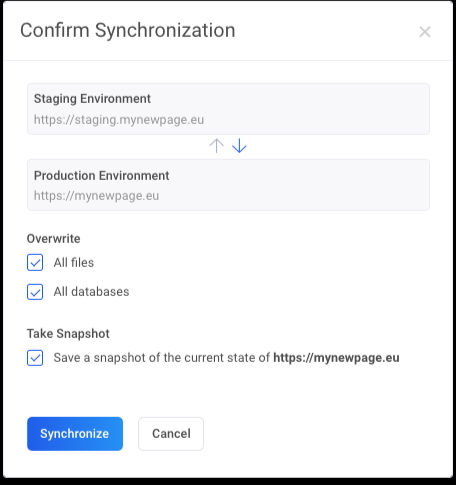 Starting the synchronization process opens a window where you can specify whether you want to overwrite only files or also databases. It is also possible to create a backup of the application to be overwritten for security purposes before synchronization, which can be used to restore the overwritten application.
