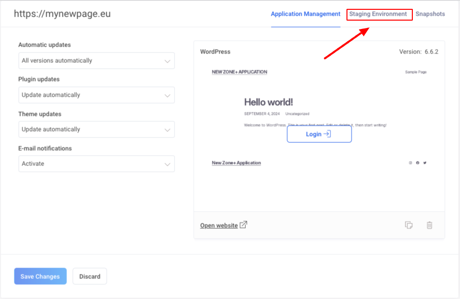 First, open the Zone+ menu at the top and navigate to the applications section. Look for the appropriate WordPress application to create a testing environment for. In the application view, click on the Settings button.