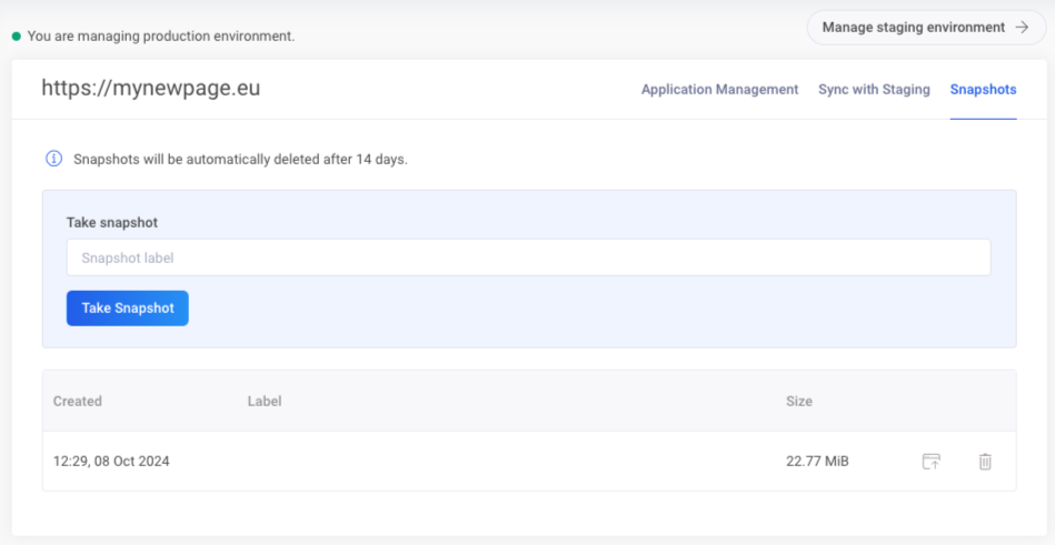 Previous snapshots before synchronization can be viewed in the Snapshots view. In this view, you can restore from snapshots or delete them using the respective Restore and Delete buttons. If desired, you can manually save snapshots whenever you desire.