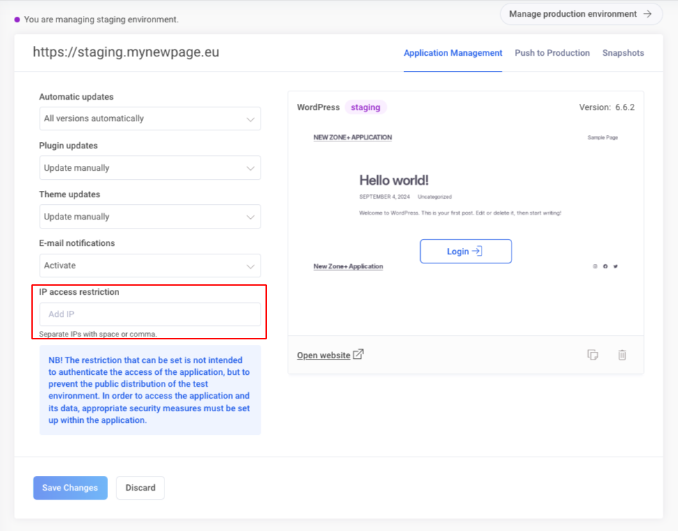 When setting up a testing environment, it is possible to restrict access to the page only to allowed IP addresses. After setting up the environment, you can modify this by following the following path: Zone+ -> Settings -> Application Management. There, you can add and remove IP addresses in the respective field. If you want to add multiple addresses, you can separate them with either a comma or a space.
