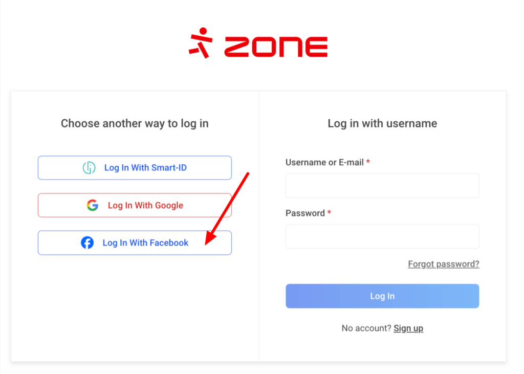 To log in with Facebook, select My Zone at the top right of the Zone homepage. A login page will open and click Log in with Facebook.