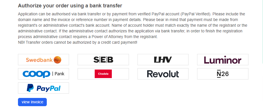 In all cases, the payment must come from the bank account of the registrant or the authorized administrative contact. When paying by separate bank transfer, the invoice number or domain name with the reference number must be included in the payment reference.