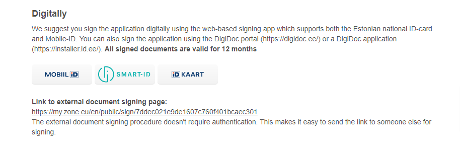 If you log in to My Zone with Smart-ID, Mobile-ID or ID-card and you are a private domain registrant or an authorized representative of the registrant, your right of representation is already established and the application does not need to be signed separately. However, if you do need to sign, there are two options, which will be displayed immediately after you submit your order.