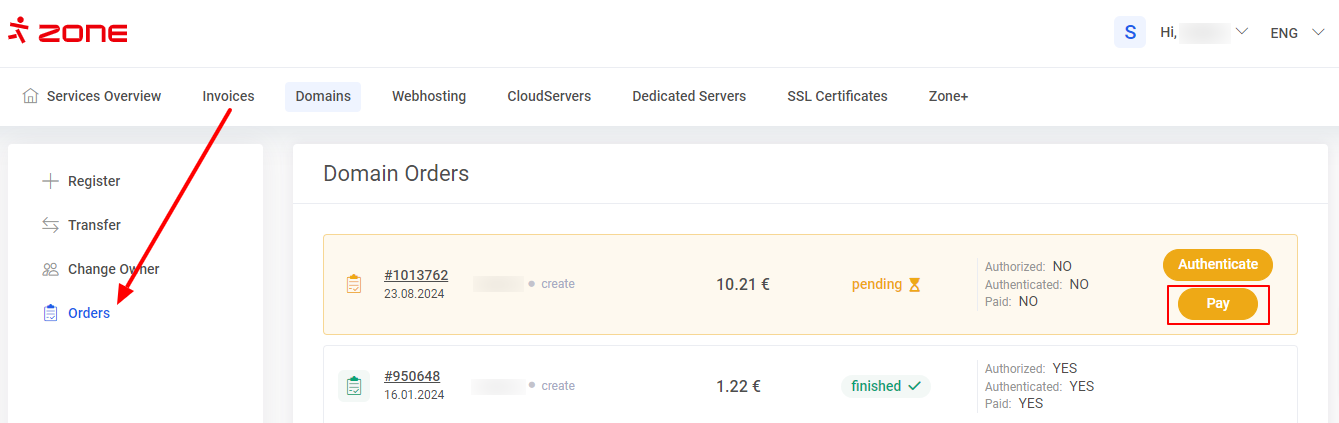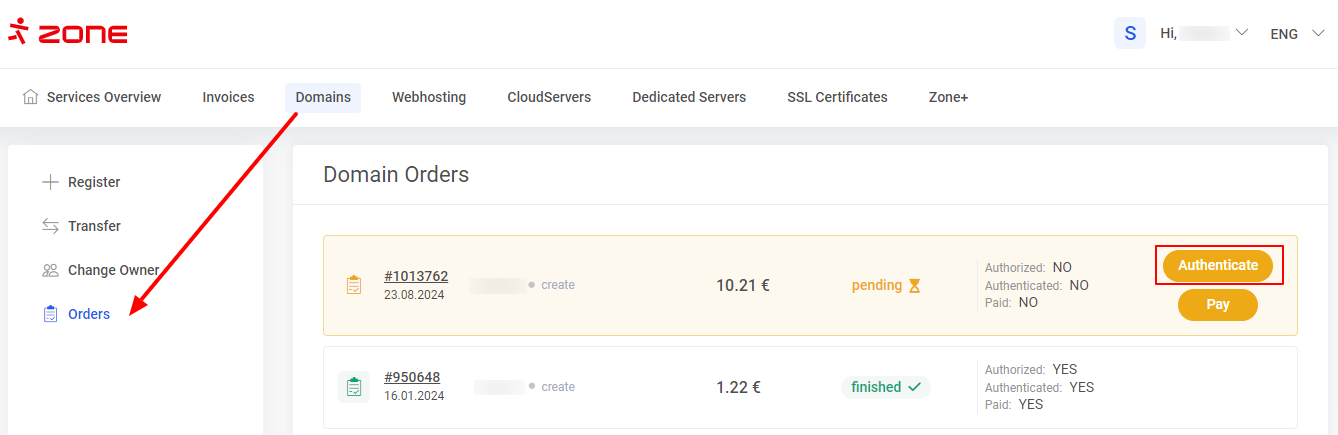 In My Zone, in the domain management, select Orders and click on the Authenticate button.