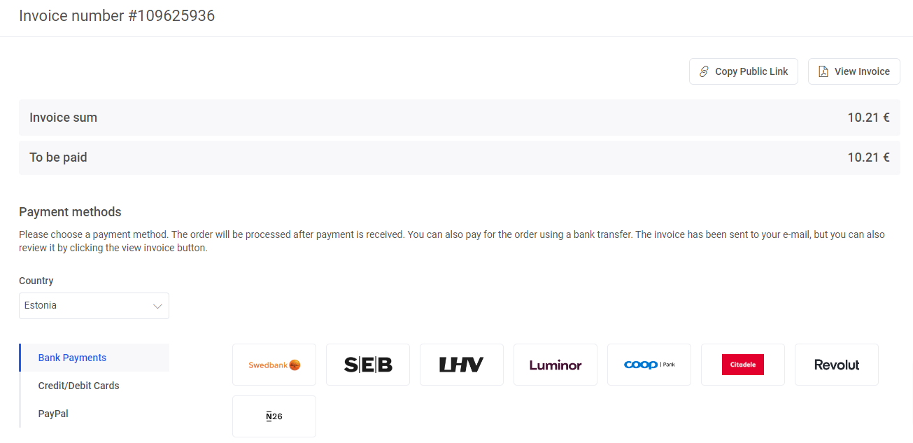 By selecting View invoice, you can download the invoice and make the payment by separate bank transfer. If you don’t want to pay the invoice yourself, you can copy the payment link from here and forward it to the person making the payment.