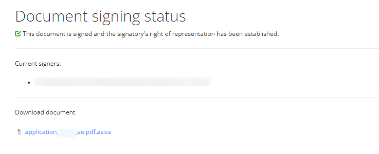 Once the application has been signed, you can download it if you wish. You will also see information on whether the right of representation has been established. If the right of representation has not been established, it is possible to have the application re-signed by the person authorized to represent the applicant, or to forward a link to the person authorized to sign the application, or to send the Power of Attorney (PoA) in the name of the signatory to info@zone.lv.
