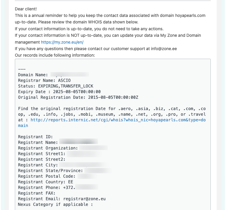 Once a year, we will send a reminder so that the domain registrant can review and, if necessary, update the contact information associated with their domain. If the information are up to date, there is no need to change anything.