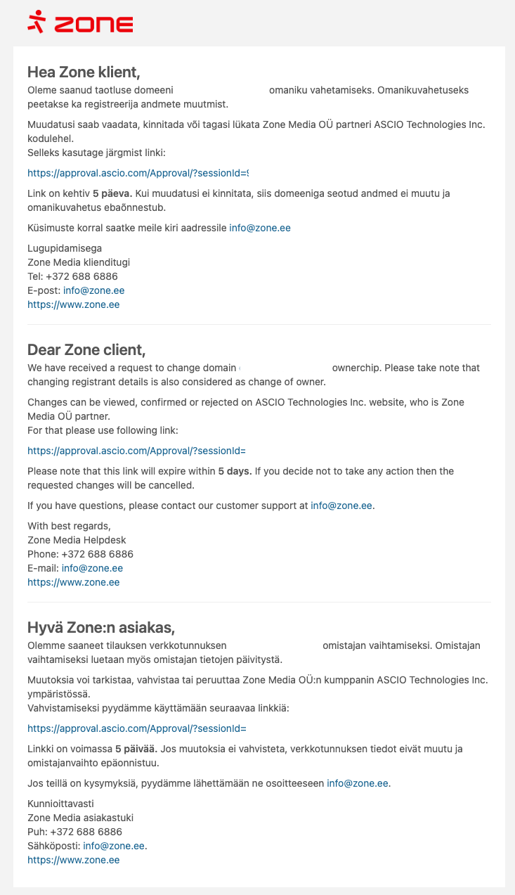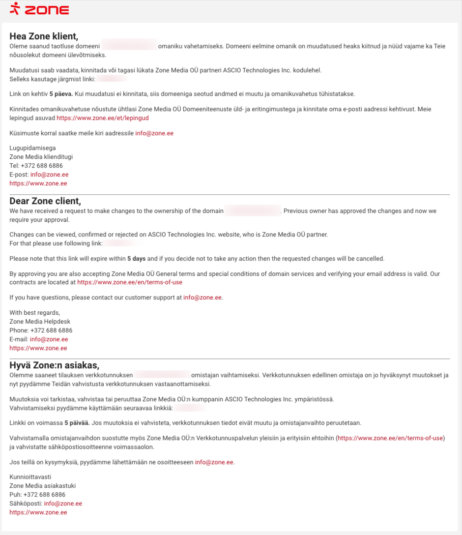 Confirmation of the e-mail address associated with the domain must be done within 15 days. The link to confirm the domain transfer and change of ownership will be active for 5 days and if the confirmation is not done within this period, the transfer and change of ownership will not take place.
