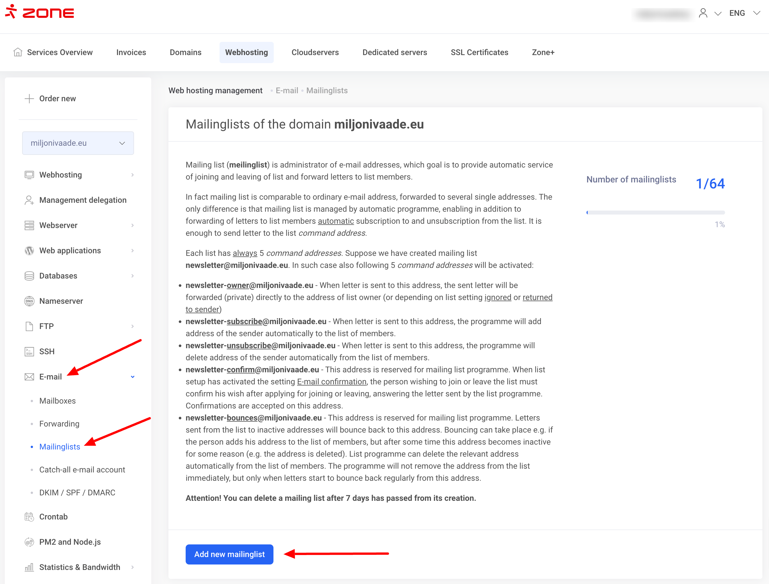 1. Lai iestatītu adresātu sarakstu, piesakies Мy Zone un pakalpojumu pārskata lapā noklikšķini uz attiecīgā hostinga. Pēc tam kreisajā izvēlnē izvēlies E-mail , Mailinglist  un Add new mailinglist.