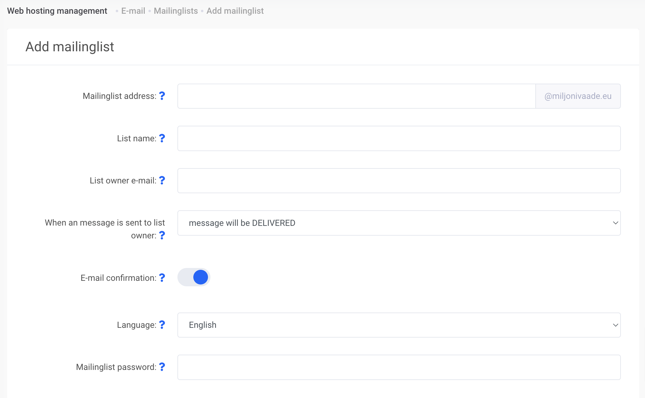 Subscribing enabled: izvēloties YES, lai abonētu sarakstu, pietiek nosūtīt e‑pastu uz komandu adresi newsletter-subscribe@domeen.eu. Izvēloties NO, programma noraidīs abonēšanas pieteikumus, un dalībniekus varēs pievienot tikai īpašnieks manuāli, izmantojot tīmekļa hostinga pārvaldību.