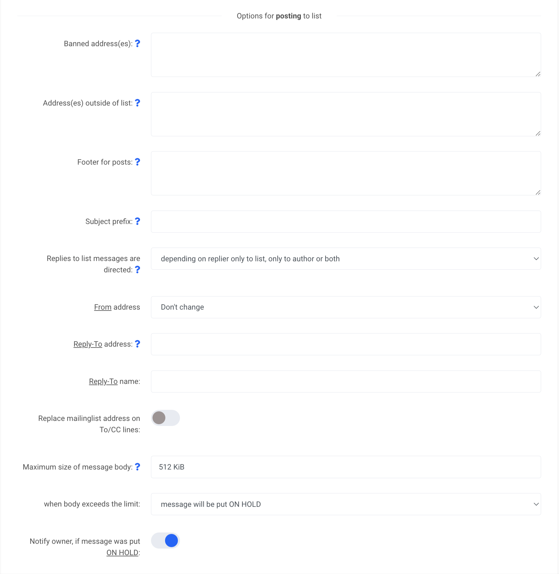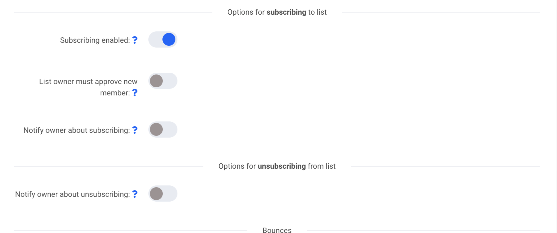List owner must approve new member: izvēloties YES, īpašniekam manuāli jāpārbauda visi automātiskie abonenti pirms to pievienošanas sarakstam, kā arī manuāli jāapstiprina vai jānoraida abonents, izmantojot tīmekļa hostinga pārvaldību.