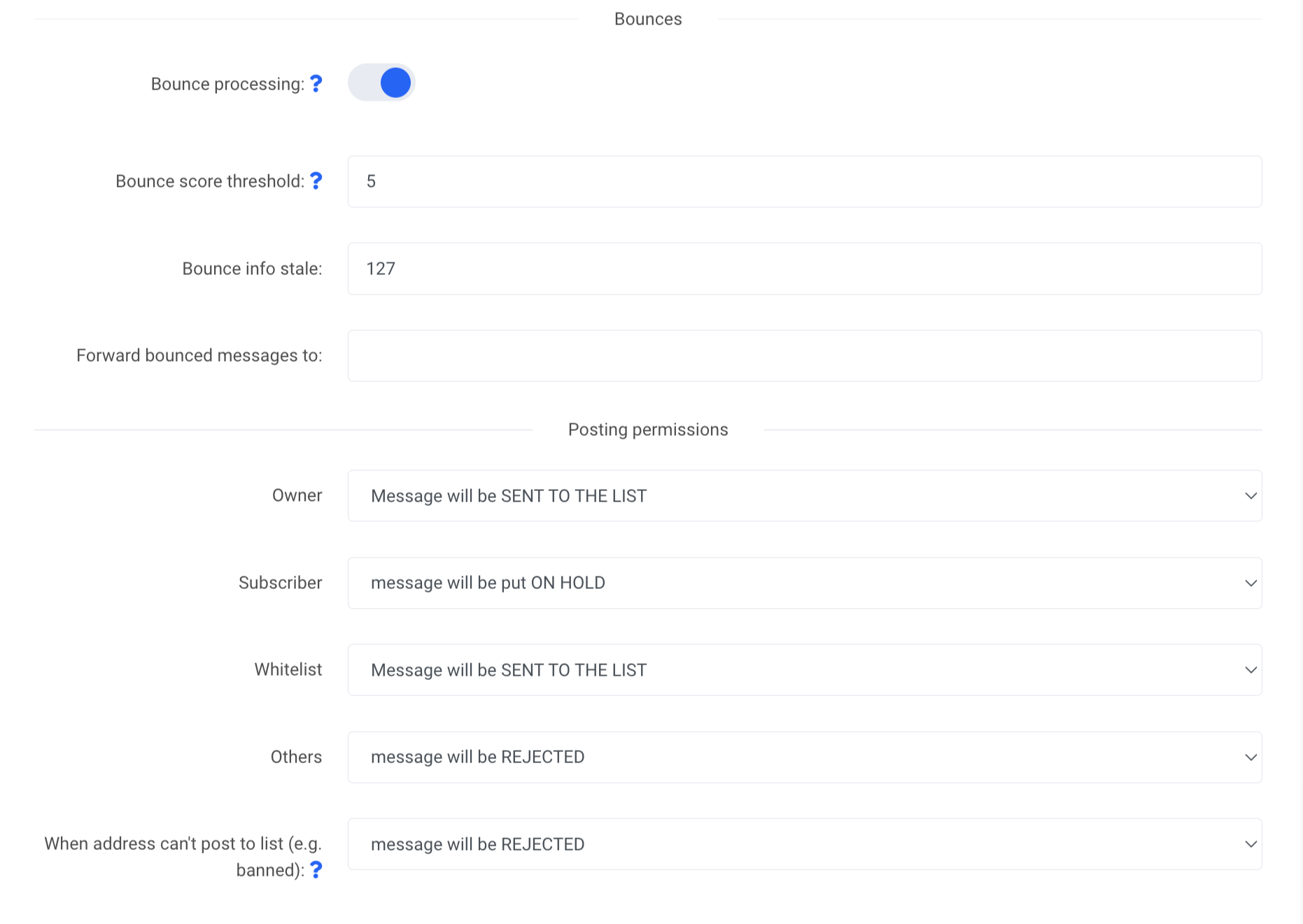 List owner email: E‑pasta adrese, uz kuru adresātu saraksta programma sūtīs ar adresātu sarakstu saistītos ziņojumus. Šī adrese netiks automātiski pievienota adresātu saraksta dalībnieku sarakstam. Kad ziņojums tiek nosūtīts saraksta īpašniekam: katram sarakstam vienmēr ir 4 komandu adreses, no kurām viena ir newsletter-owner@domeen.eu (atbilstoši tavam domēna nosaukumam). Šeit vari konfigurēt, kāda darbība tiks veikta, kad ziņojums tiek nosūtīts adresātu saraksta īpašniekam. Vai ziņojums tiek piegādāts īpašniekam, noraidīts vai ignorēts.