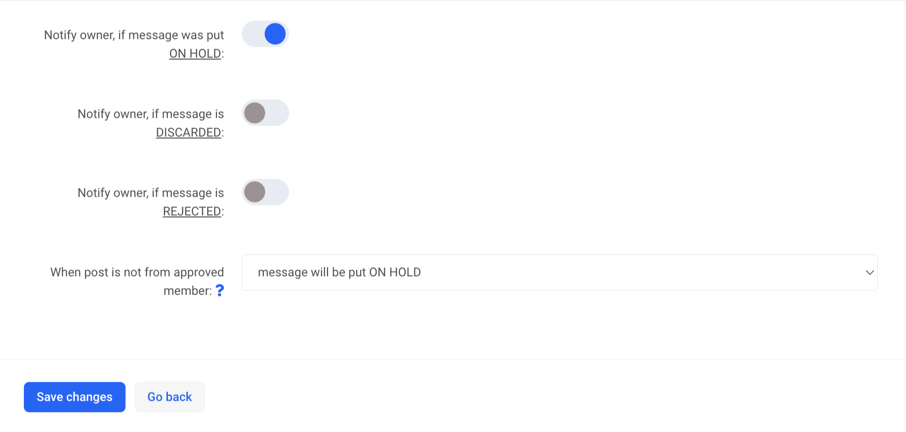 Notify owner, if the message was put ON HOLD, if the message is DISCARDED or if the message is REJECTED: saraksta īpašnieks var saņemt paziņojumu, ja ziņojums ir aizturēts, izmests vai noraidīts.