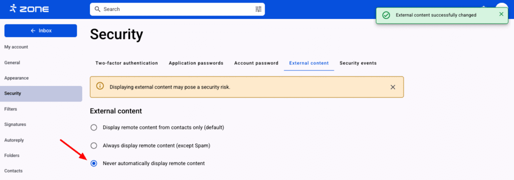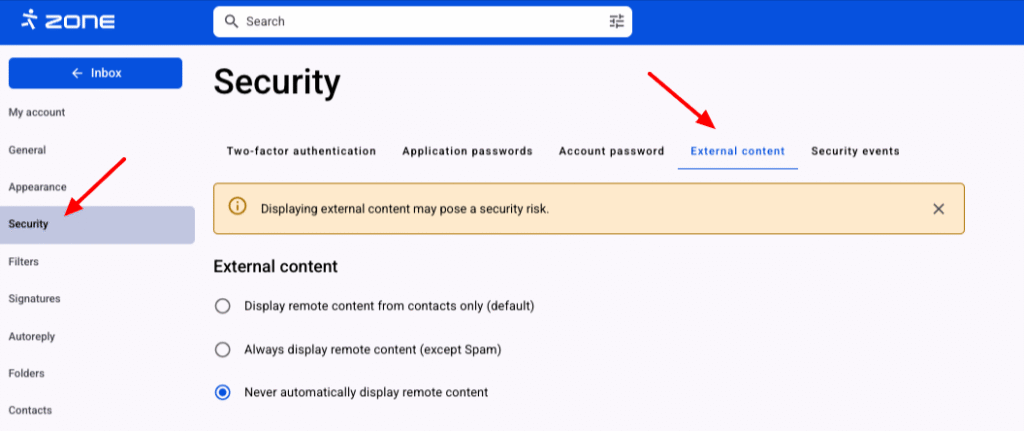 Izvēlies Drošība un Ārējais saturs.
