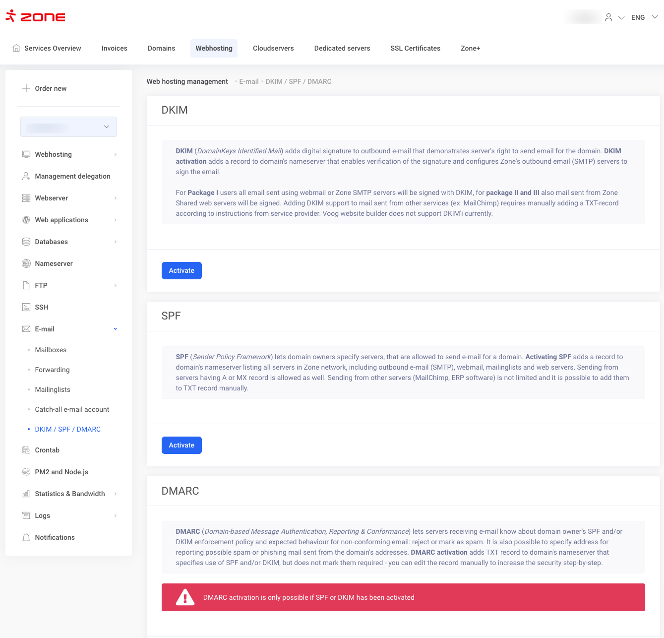 DKIM tehnoloģiju var aktivizēt My Zone vadības panelī, servera pārvaldībā sadaļā E-mail -> DKIM / SPF / DMARC.