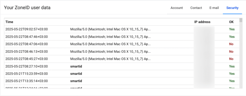 Izvēlnē Security ir arī apakšizvēlne Login history, kas parāda ZoneID konta autentifikācijas žurnālu. Žurnālā redzami veiksmīgi un neveiksmīgi pieteikšanās mēģinājumi par pēdējo gadu, kā arī IP adreses, no kurām pieteikšanās mēģinājumi tika veikti.