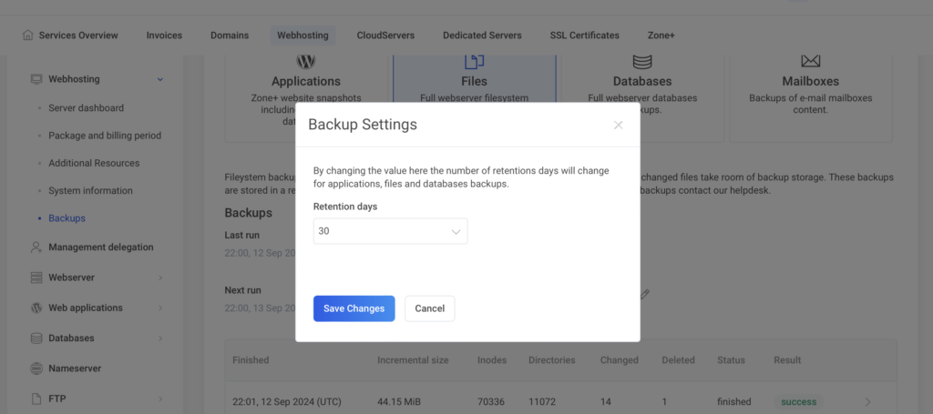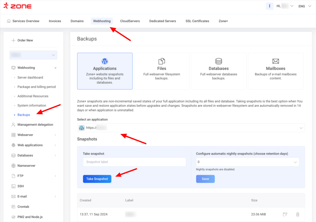 Momentuzņēmumus var izveidot un izmantot My Zone vadības panelī, izvēloties Webhosting un Backups.
