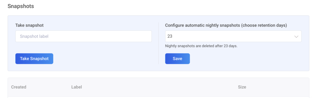 Nākamajā logā varat izvēlēties savu tīmekļa lietotni un manuāli izveidot jaunu momentuzņēmumu vai veikt atjaunošanu no esoša momentuzņēmuma. Varat arī pievienot etiķetes, lai momentuzņēmumus būtu vieglāk atšķirt (piem., “pirms atjauninājuma”).