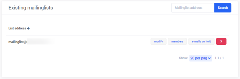 Pakalpojumu pārskata lapā noklikšķini uz servera nosaukuma un izvēlies Email–>Mailinglists–>Add new mailinglist.