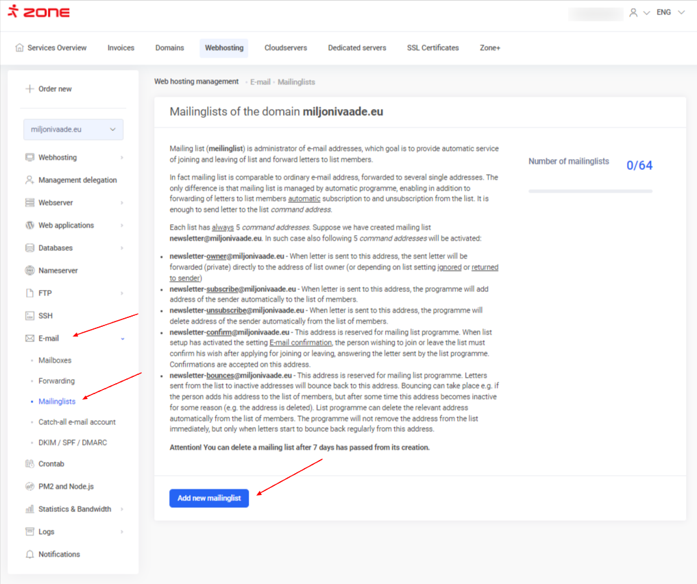Ja tavs galvenais domēns ir reģistrēts Zone un tas izmanto Zone vārdu serverus, tev tikai nepieciešams pasūtīt jaunu tīmekļa mitināšanas pakalpojumu apakšdomēna nosaukumam. Pēc tam vari sākt veidot adresātu sarakstus.