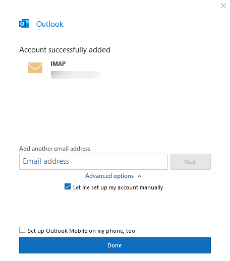 6. Ja visi iestatījumi ir pareizi, tiek parādīts paziņojums Account successfully added. Noklikšķini Done, un e-pasta konta iestatīšana Outlook ir pabeigta.