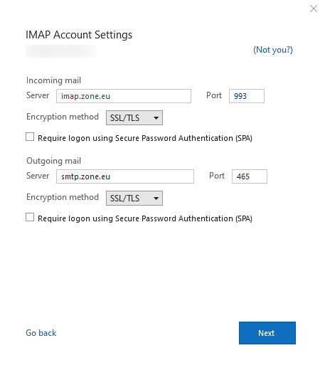 - Ienākošā pasta serveris, t.i., IMAP serveris: imap.zone.lv ports 993