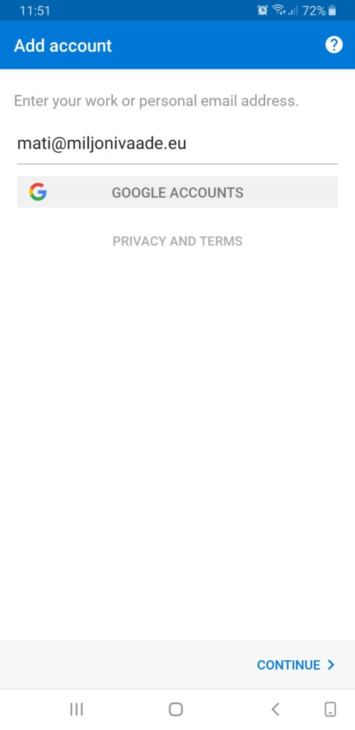 2. Ievadi e-pasta adresi, kuru vēlies konfigurēt, un nospied Turpināt.