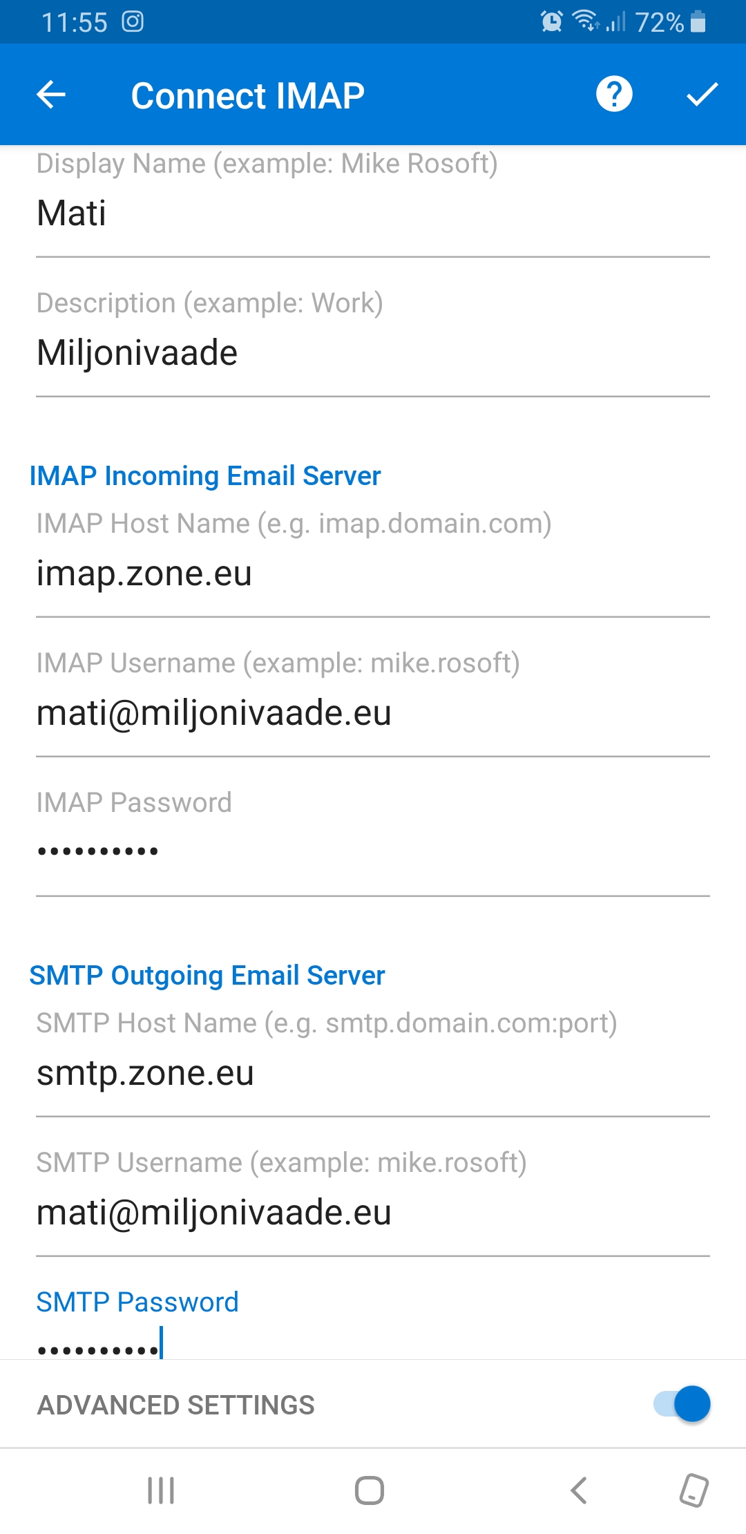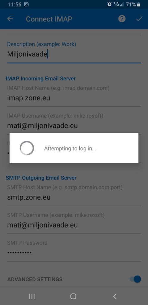 Tālāk izvēlies IMAP un nākamajā lapā aktivizē opciju Papildu iestatījumi, pēc tam aizpildi visus laukus atvērtajā izvēlnē.