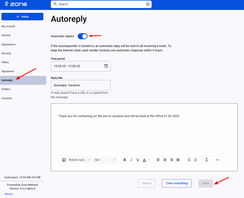 Ievadiet vēlamo automātiskās atbildes Laika periodu, atbildes virsrakstu un atbildes saturu.