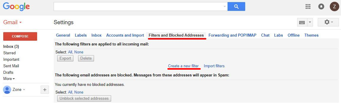 2. Iestatījumos izvēlieties “Filtri un bloķētās adreses”, pēc tam noklikšķiniet “Izveidot jaunu filtru”.