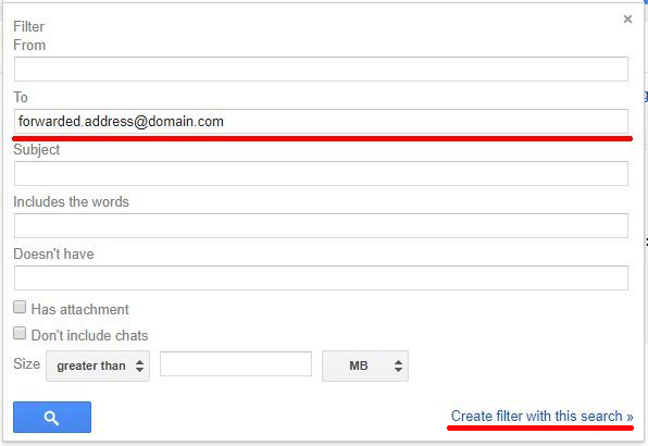 3. Laukā “Kam” ievadiet savu pārsūtīto adresi. Ja jūsu adrese iepriekš jau ir tikusi pārsūtīta, pirms filtra pievienošanas ieteicams pamēģināt meklēšanu. Tādā veidā ir iespējams atrast iepriekšējās sarakstes. Noklikšķiniet “Izveidot filtru ar šo meklēšanu”.