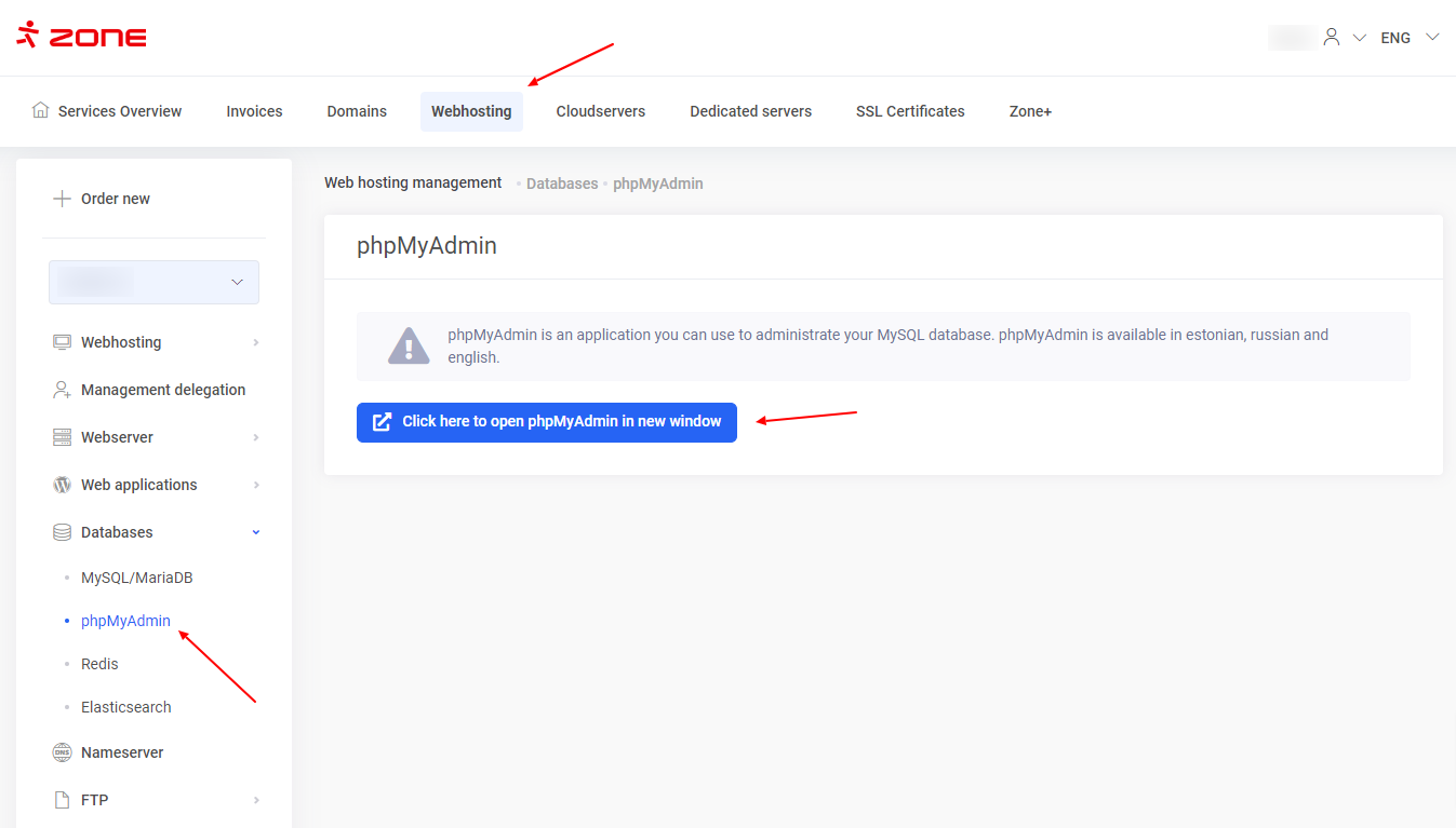 Kamēr esat pieteicies My Zone, izvēlieties Webhosting ->Databases -> phpMyAdmin