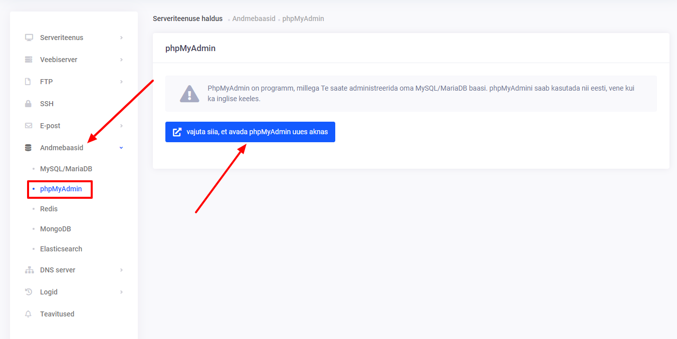Piekļuve phpMyAdmin, izmantojot servera pārvaldību