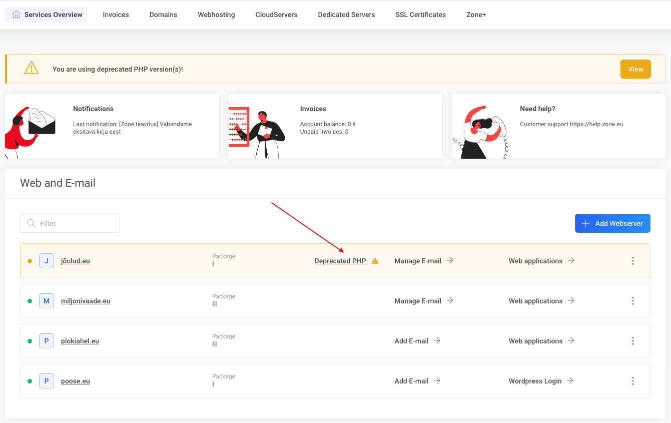 Ja daži no taviem virtuālajiem serveriem izmanto novecojušas PHP versijas, lapā My Zone Overview parādīsies brīdinājums.