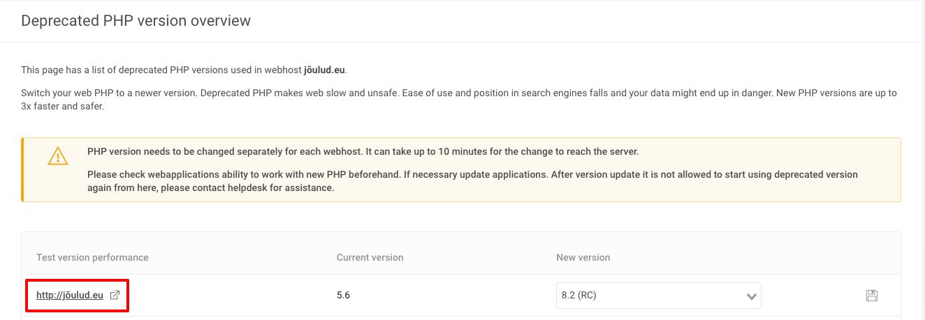 Tā kā PHP versijas maiņa var izraisīt kļūdu paziņojumus vietnē un izmaiņas var aizņemt līdz 3 minūtēm, pirms maiņas ieteicams notestēt vietnes darbību.