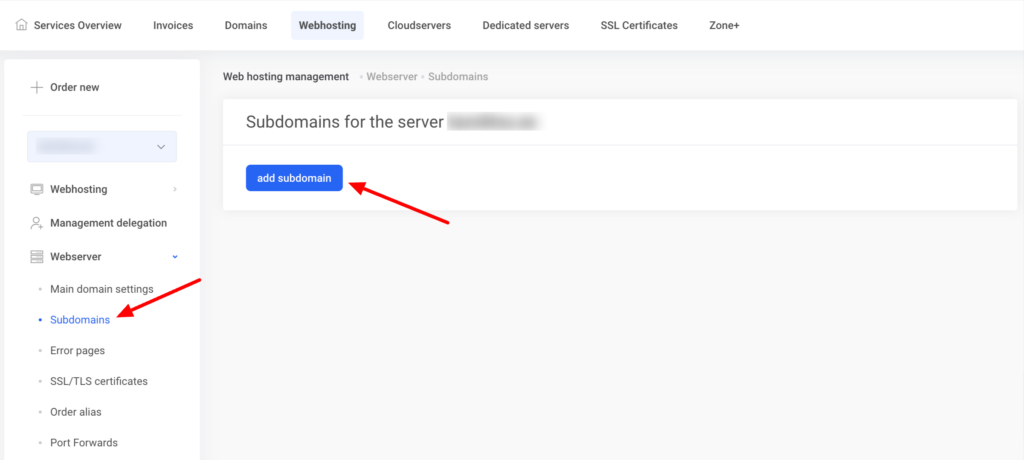 Ja galvenā domēna vārdu serveri (nameservers) ir norādīti citur, t. i., tiek izmantoti cita pakalpojumu sniedzēja vārdu serveri, tad pie šī pakalpojumu sniedzēja apakšdomēnam ir jāizveido A ieraksts. A ieraksta IP adresi vari atrast kreisajā izvēlnē Webhosting sadaļā, izvēloties Webhosting, System Information un IP Address