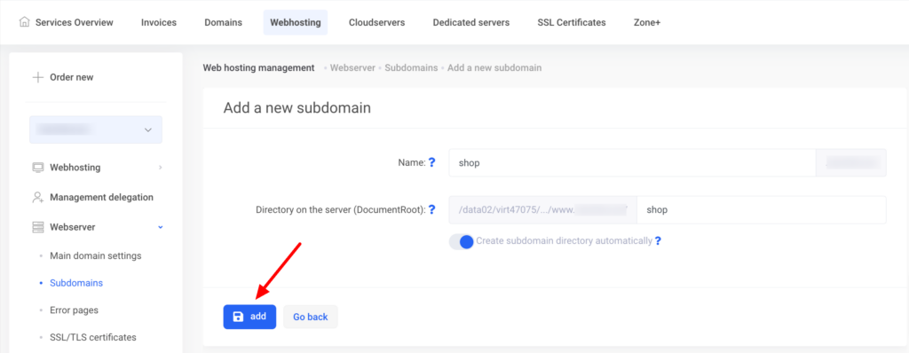 Jaunajā lapā ievadi apakšdomēna nosaukumu, piemēram, staging, test vai shop.