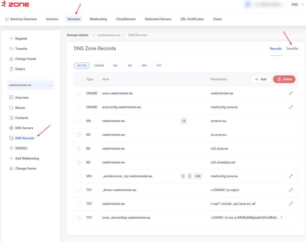 Ja jūs izmantojat tīmekļa mitināšanas pakalpojumu citur, bet domēns ir Zone reģistrā un izmanto Zone nosaukumserverus, DNS zonas failu var atrast domēna pārvaldībā sadaļā DNS ieraksti: